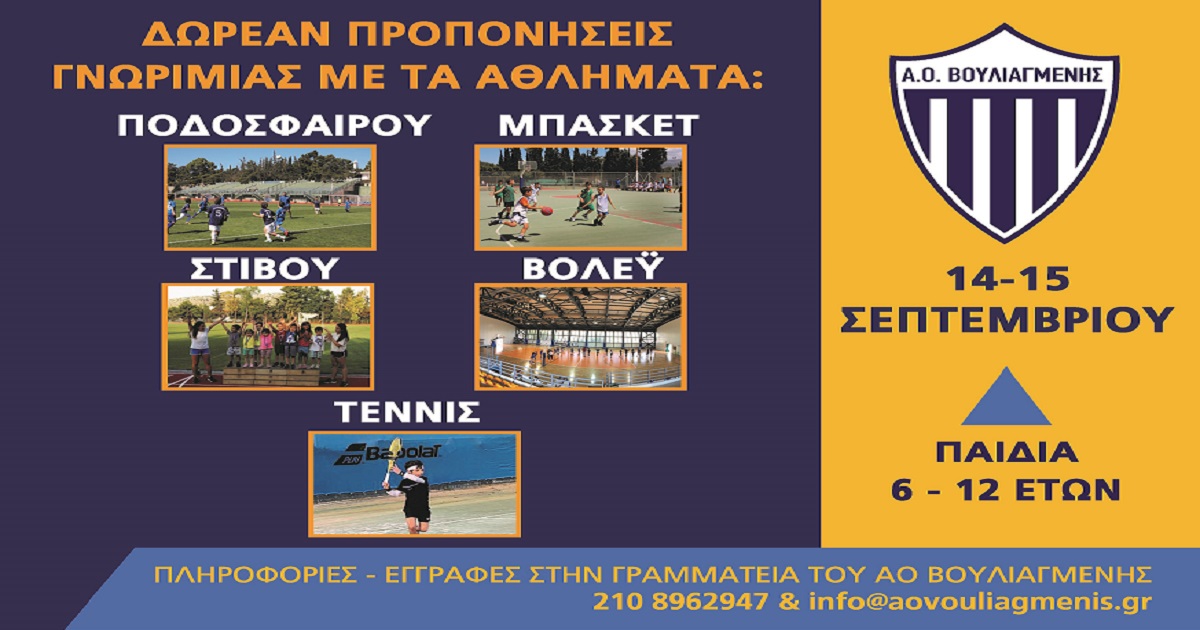 Ο Αθλητικός Όμιλος Βουλιαγμένης και ο Σύλλογος Γονέων και Κηδεμόνων του Δημοτικού Σχολείου Βουλιαγμένης, στην προσπάθεια τους, να προάγουν το αθλητικό πνεύμα, δίνουν την ευκαιρία στους μαθητές και τις μαθήτριες του Δημοτικού Σχολείου της Πόλης μας, να έρθουν σε επαφή με τον αθλητισμό, διοργανώνοντας μια δωρεάν δράση προπονήσεων γνωριμίας, στα αθλήματα του Ποδοσφαίρου, Μπάσκετ, Βόλεϊ, Στίβου και Τένις, που ο Όμιλος διατηρεί.
